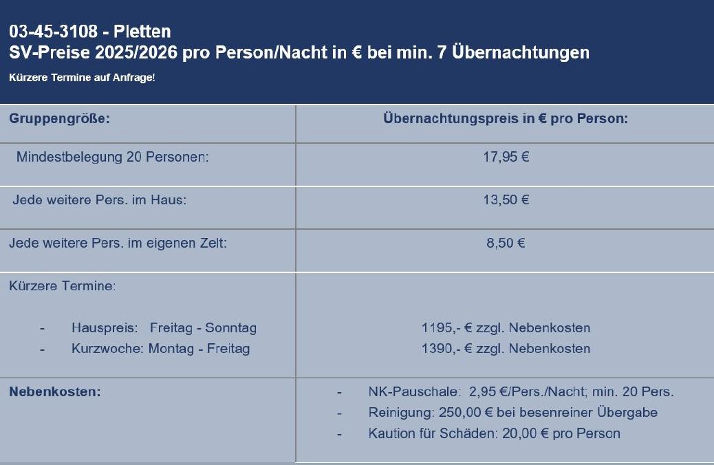 Die Küche ist für die Größe des Gruppenhauses gut ausgestattet. Es gibt einen großen Kühlschrank und einen Gefrierschrank. Zwei Elektroherde mit Backöfen sind vorhanden. Die Miele Spülmaschine verfügt über ein Schnellspülprogramm (20 min).Eine Mikrowelle und 2 Kaffeemaschinen stehen zur Verfügung. In der Küchenzeile im Aufenthaltsraum befindet sich ein Trockenschrank, indem bequem feuchte oder nasse Sachen getrocknet werden können.Direkt daneben stehen 2 Hochschränke mit Putzutensilien. Es gibt ausreichend Geschirr für 40 Personen.