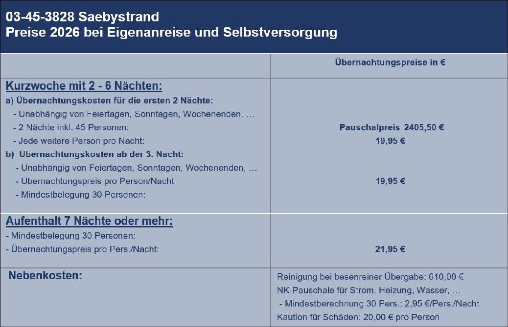 Das Selbstversorgerhaus Saebystrand liegt in Dänemark, in Nordjütland, nur 1 km von der City von Saeby und ca. 300 m vom breiten Sandstrand der Ostsee entfernt in einer zentralen aber ruhigen Lage. Der Strand ist selbst in der Hochsaison nicht überfüllt und lädt bei schönem Wetter zu vielfältigen Aktivitäten ein: Schwimmen, Surfen, Segeln, Sandburgen bauen, Strandwanderungen, Muscheln suchen, Krebse fangen. Ein kleines, hügeliges Waldgebiet mit verschlungenen Wegen entlang eines kleinen Baches liegt etwa 1 Km vom Gruppenhaus entfernt. Am Strand entlang führt ein langer, abends beleuchteter und gepflasterter Weg, an dem man bis zum Hafen gehen kann.