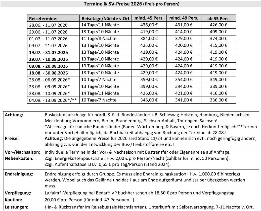 Aufgrund unserer Gruppengrößen sowie verschiedene Erfahrungen in den letzten Jahren sind wir in der Lage optimale Verpflegungspakete mit qualifizierten Köchen zu attraktiven Preisen anbieten zu können. Fragen Sie uns einfach danach...