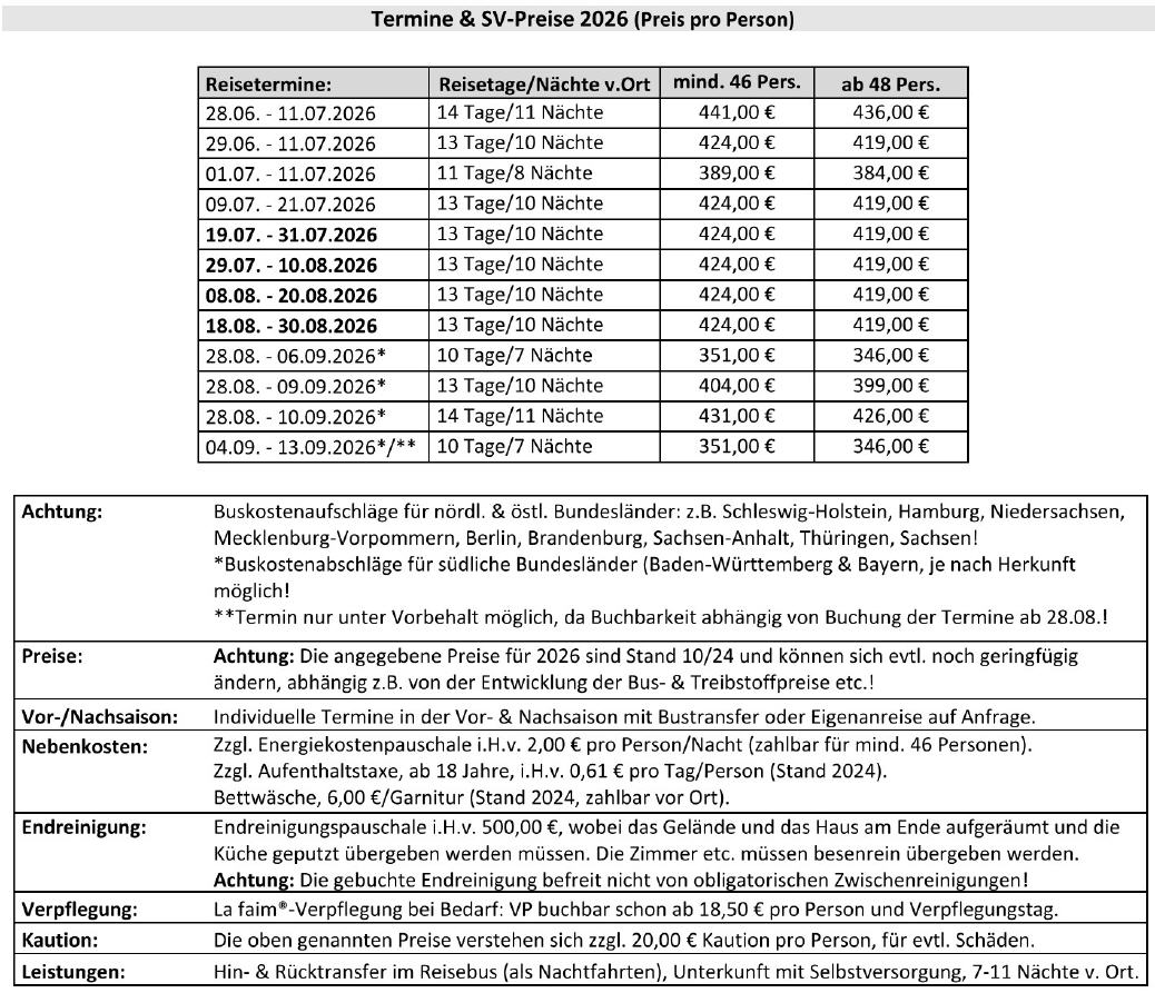Daher können Sie bei uns nicht nur die Unterkunft buchen, sondern auch eine Vollverpflegung. Diese besteht aus einem Frühstück, Lunchpaket und einer warmen Mahlzeit. Unsere erfahrenen Reiseköche „La faim“ werden Ihnen abwechslungsreiche und je nach örtlichen Gegebenheiten, landestypische Mahlzeiten zubereiten. Bei der Zubereitung Ihrer Mahlzeiten nehmen unsere Reiseköche gerne Rücksicht auf Allergien/Unverträglichkeiten (soweit es möglich ist), vegetarische und muslimische Ernährung. Getränke (Kaffee, Tee und Milch) werden nur zum Frühstück gereicht. Alle anderen Mahlzeiten werden mit Getränken durch die Gruppe versorgt. Für die Vor- und Nachbereitungen (z.B.: Kartoffel schälen, Tische eindecken, spülen …) sollten Sie je nach Gruppengröße 2-8 Teilnehmer als Hilfe für die einzelnen Mahlzeiten einteilen. Leider ist es im Vorfeld nicht möglich einen Essensplan zu erstellen, da sich unsere Reiseköche an die örtlichen Supermärkte anpassen müssen und erst beim Einkaufen entscheiden können, welche Mahlzeit Ihnen schmackhaft zubereitet werden kann.