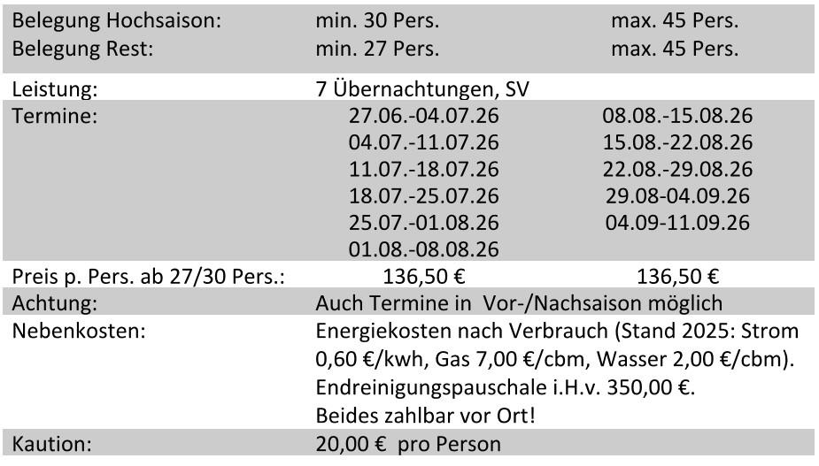 Die 60 qm große Gewerbeküche ist gut ausgestattet. In einem alten Steinbackofen, der sich in einem kleinen Nebengebäude befindet, können Pizzen oder Brote gebacken werden Die Loggia in der Nähe der Küche ist überdacht dort haben ca 50 Personen Platz, ebenfalls gibt es eine Durchreiche vom Steinofenbereich aus. Diese Gruppenunterkunft steht auf einem großen Grundstück. Eine renovierte Scheune mit 100 qm kann als Speise/Party- oder Seminarraum genutzt werden. Darüber hinaus kann eine Zeltkonstruktion (Pavillon 18x12 m mit Holzboden) für verschiedenste Aktivitäten im Freien genutzt werden. Das Gruppenhaus liegt inmitten freier Natur mit viel Grün für Spiele und Outdoor-Aktivitäten. Auf dem Geände gibt es auch einen eingezäunten Bolzplatz, der nach Absprache mit der Dorfjugend genutzt werden kann.