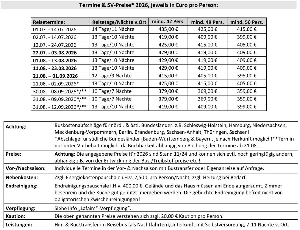 Achtung: Aufgrund der Lage sollte für Einkäufe, Arztbesuche und Strandfahrten ein Begleitfahrzeug eingeplant werden.