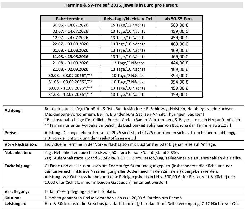 Unser Gruppenhaus liegt in unmittelbarer Strandlage. Das gesamte Haus besteht aus 2 Hausteilen: Haus A mit 28 Betten und Haus B mit 27 Betten, die in der Hochsaison zusammen vermietet werden. Die Unterbringung erfolgt in 2-6-Bettzimmern, alle mit Meerblick und Duschen und Toiletten auf den Zimmern. Eine typische Zimmeraufteilung ist = 1 franz. Bett und 1 Einzelbett.